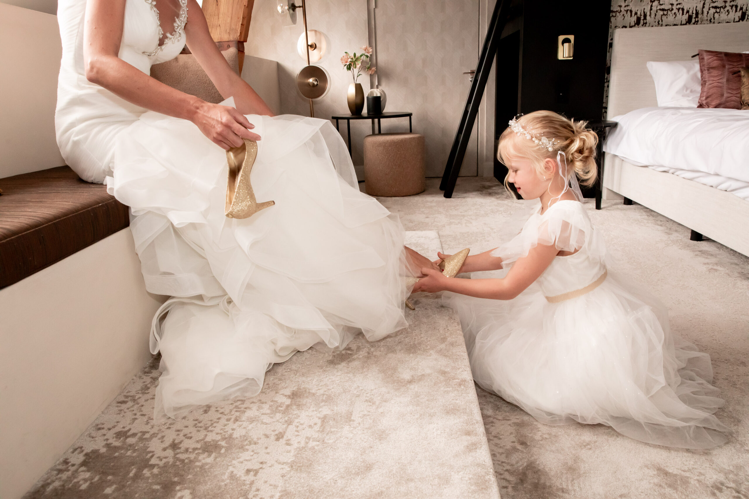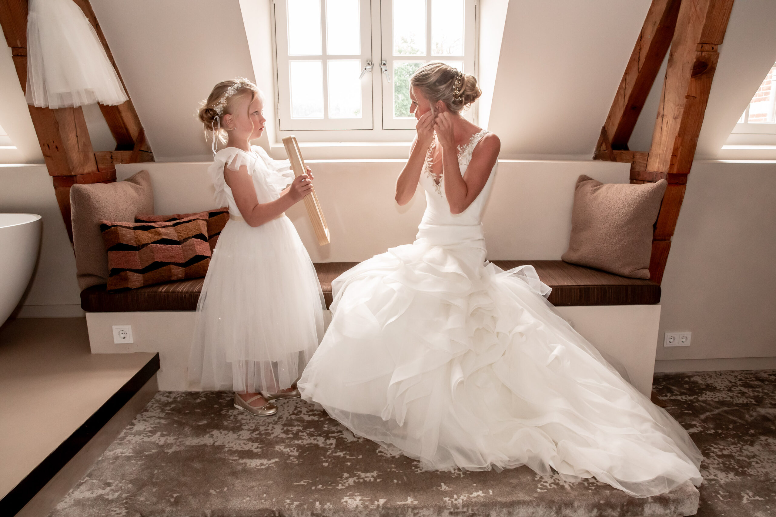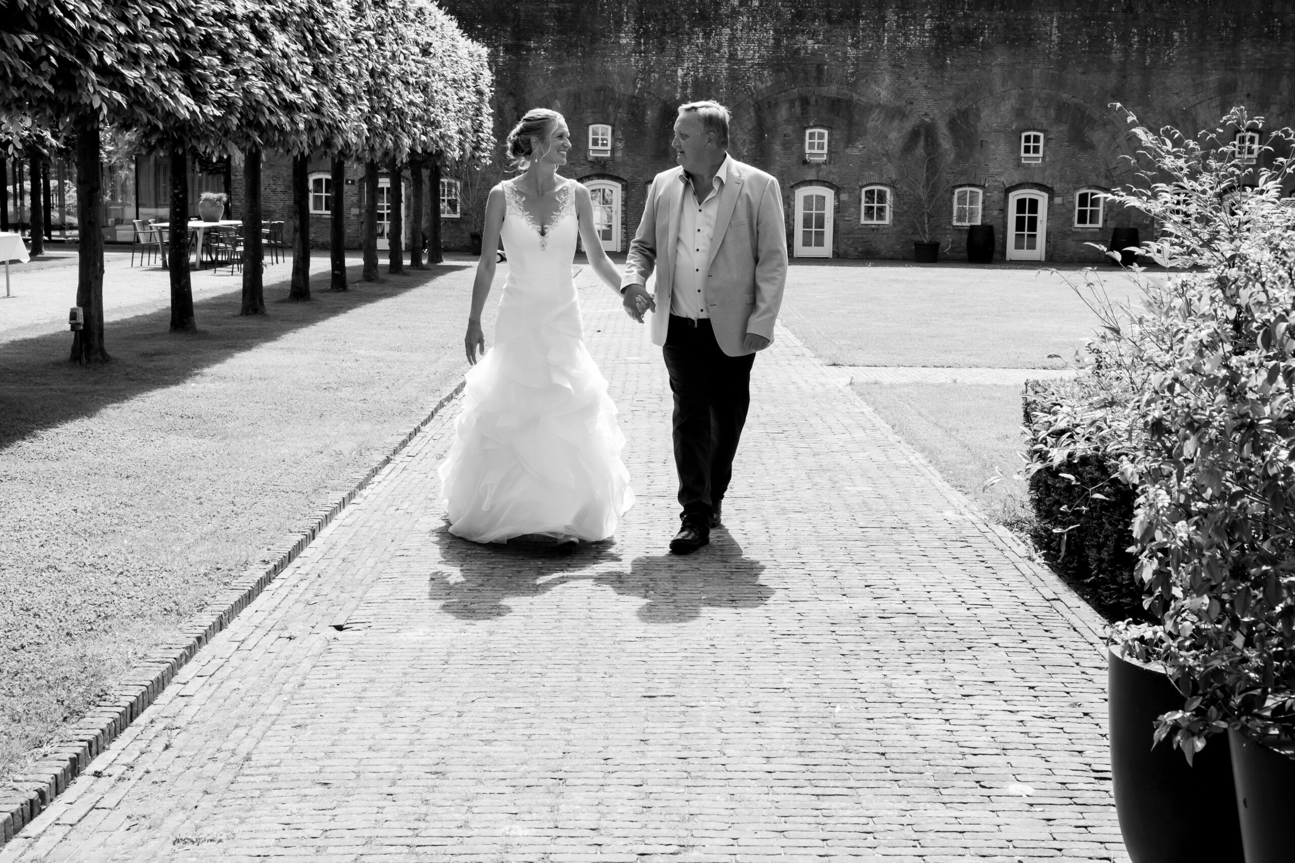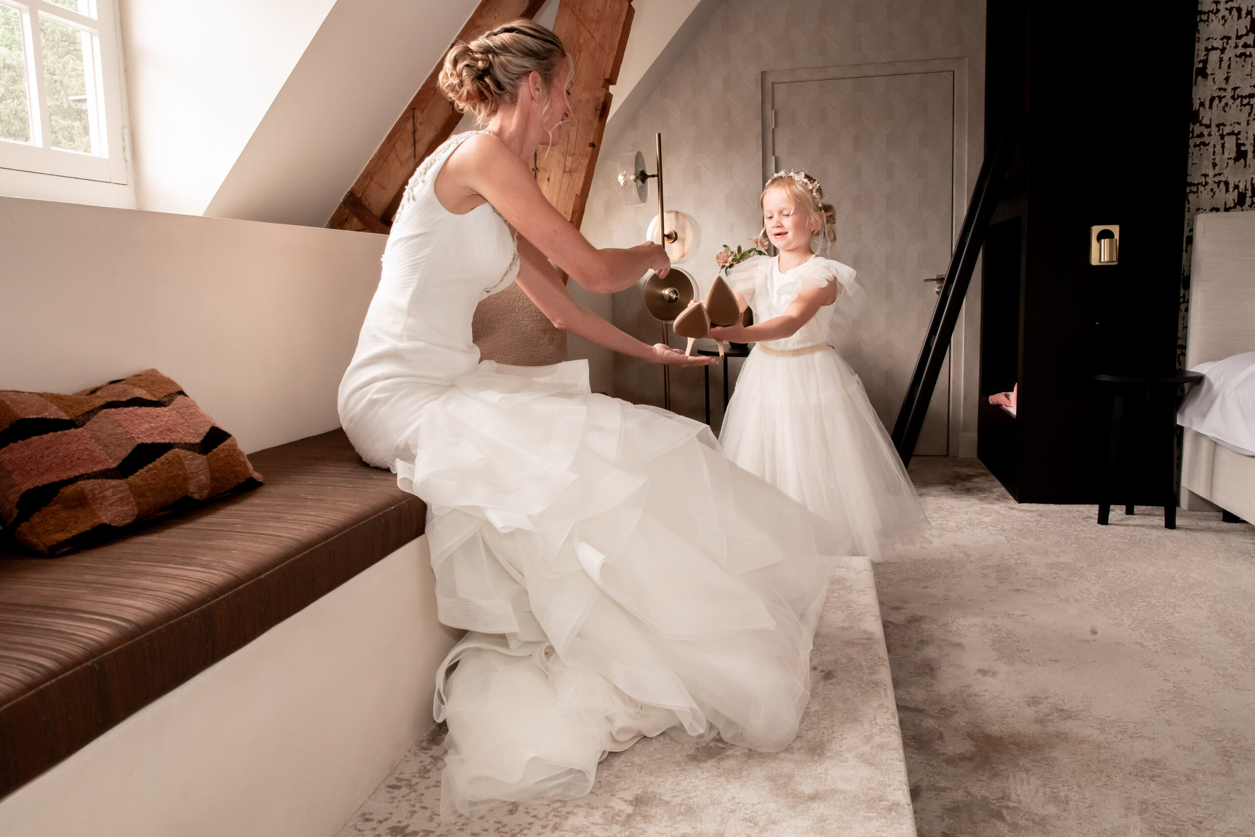Het was zover, na zolang wachten, de bruiloft van Janneke en Joris. De hele dag vond plaats op de trouwlocatie Ovum in Grave. Van de voorbereidingen, het omkleden tot bruid en bruidegom tot en met het trouwfeest. Deze locatie zit zo dichtbij waar ik woon dat ik bijna op de fiets had gekund, maar met alle apparatuur niet handig. Toen ik bij de trouwlocatie aankwam, waren zowel de bruid en bruidegom heel relaxed. Eerst ging ik bij de bruid de haren en make up fotografeer, daarna het omkleden van Joris met een goede vriend. Toen ging de trouwjurk aan, samen met alle dierbaren om haar heen, inclusief haar moeder en dochter die de eer hadden de jurk te mogen aantrekken bij haar. En wat een plaatje, zo mooi! Daarna gingen wel de trouwreportage bij de trouwlocatie Ovum en in het parkje eromheen doen. Met een lekker broodje relaxed mee voor onderweg die ze heerlijk op een bankje in het park hebben gegeten. Vervolgens was de mooie ceremonie in het kapelletje. En wat hebben we gelachen om hun jongste meisje die heerlijk haar eigen gang ging. De broer trouwde het stel als ambtenaar wat het extra bijzonder en persoonlijk maakte. En wat kon hij dat goed! Na de trouwceremonie een heerlijke borrel in de mooie binnentuin met prachtig weer. Daarna volgde de familie en vriendenfoto’s, een romantisch, bijna Italiaans diner, aan een lange tafel buiten en tot slot het feest! Wat een heerlijke dag, echt genieten. En voor mij extra bijzonder dat ik hun al een paar jaar kende en ze mij hadden gevraagd voor deze dag. Dank voor het vertrouwen Janneke en Joris.